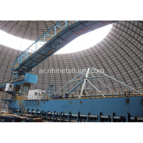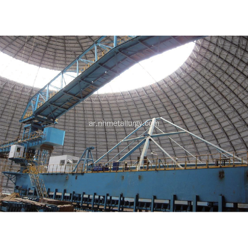 تتكون معدات الاستراحة المكدسة الدائرية هذه من بنية جسر دائرية تتحرك على مسار السكك الحديدية ولديها ذراع مكشطة متصلة به. يمكن للجسر الدائري أن يدور حول نقطة محورية مركزية ، مما يسمح له بتغطية مساحة كبيرة لتكديس المواد السائبة واستعادتها.